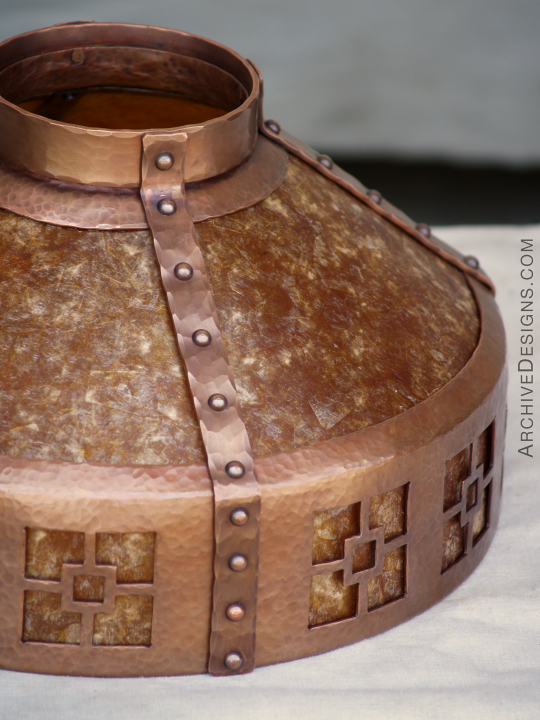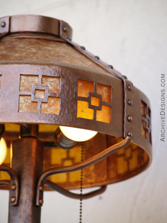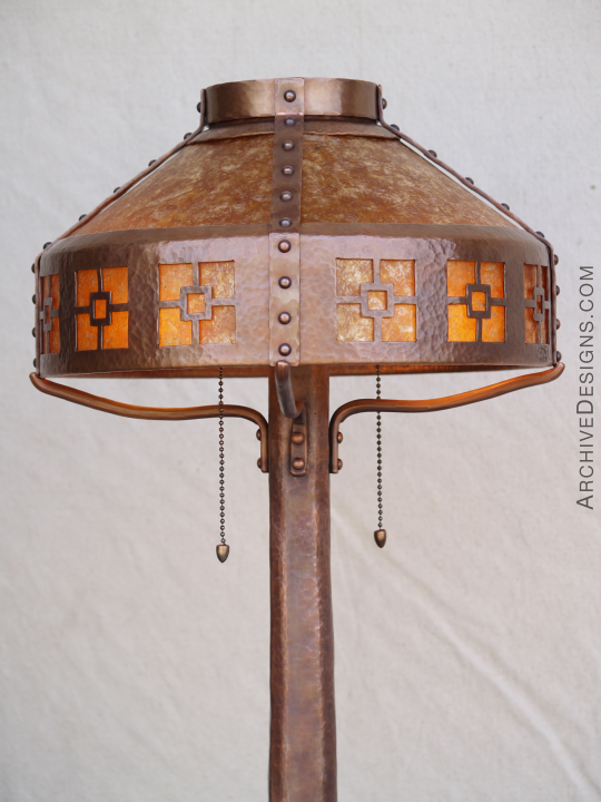 This unique hammered copper lamp—a free-standing torchiere—was designed for long-time clients for their California bungalow. The cutouts in the shade, with glowing amber mica behind, are abstractions of flowers in the Arts & Crafts style, and the top cone is also of translucent amber mica. This piece was one among several pieces made for the same client, including a fireplace screen, chandelier, and range hood.